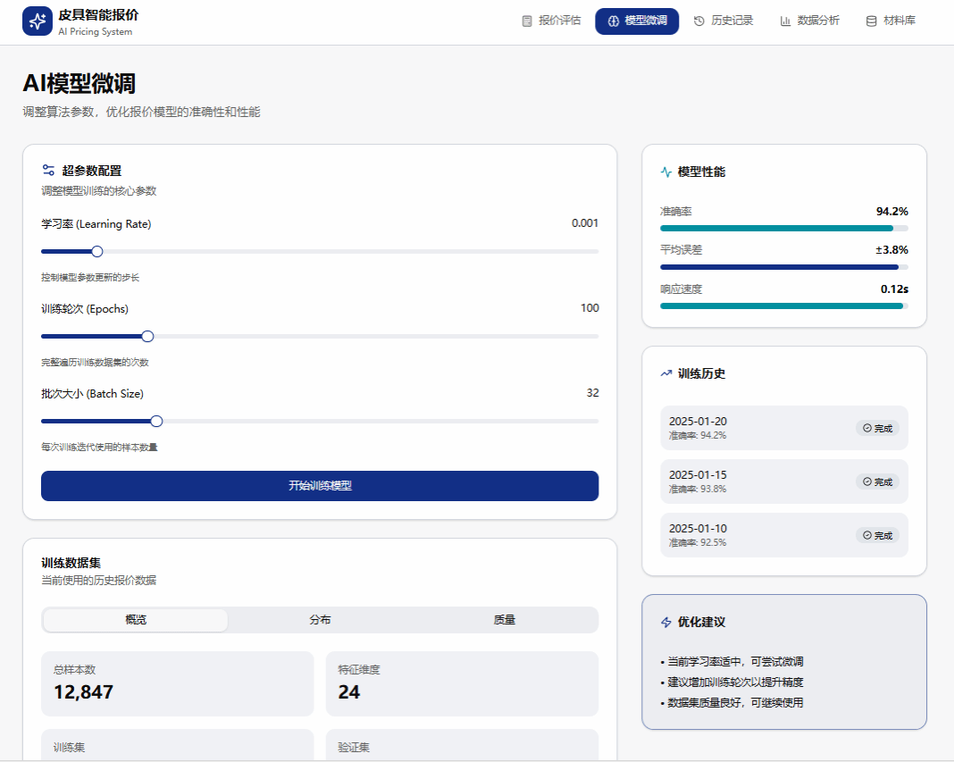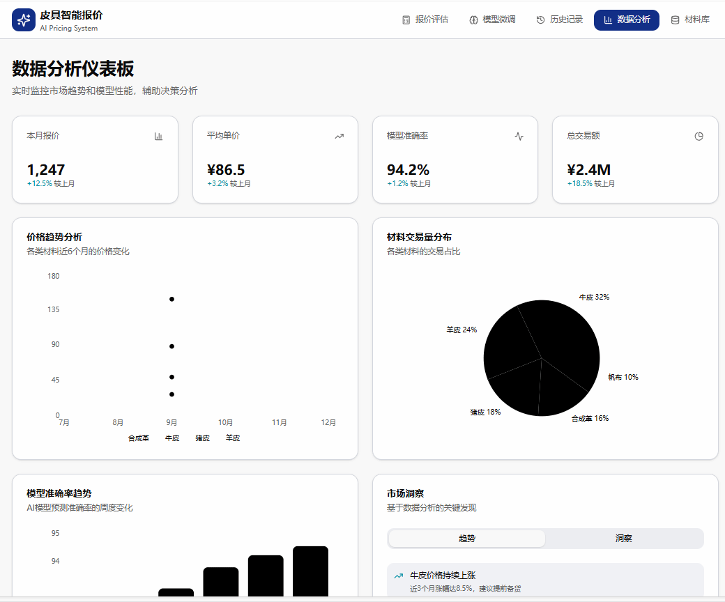 该项目聚焦皮具行业传统定价依赖经验、效率低、误差大的痛点,创新研发智能定价解决方案。项目以真实个性化订单数据为基础,通过遗传算法、退火算法等技术生成模拟数据,解决小样本数据训练难题;再结合多元线性回归等算法,构建 AI 定价模型,可输出 “底线报价、预估报价、市场期望报价” 三类精准范围,助力企业快速响应客户需求、降低运营成本。目前系统已实现多维度功能落地,材料库涵盖 24 个主要类别、16600 平方米库存的 18 家供应商材料信息,模型最新准确率达 94.2%,本月交易额较上月增长 18.5%,展现出极强的市场应用价值。