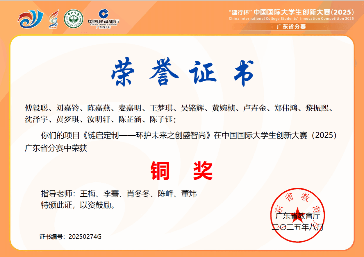 2025 年 “建行杯” 中国国际大学生创新大赛广东省分赛落下帷幕。曙光大数据学院联合创新创业学院,凭借《链启定制 —— 环护未来之创盛智尚》项目(核心为 “基于真实个性化订单数据的皮具价格自动生成系统”),从众多参赛作品中脱颖而出,成功斩获省级铜奖,为学校赢得荣誉。