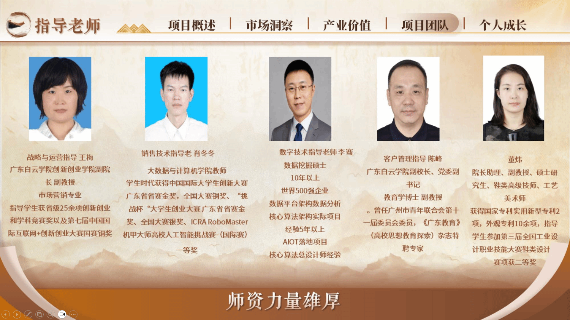 项目团队以曙光大数据学院沈泽宇、黄婉桢、吴铭辉、卢卉金等同学为技术核心成员,与多个学院不同专业共15名成员组成跨专业团队,成员们熟练掌握 SQL 数据库、Python 算法开发、Web 开发等技能,曾参与 AI 情感分析、大数据模型论证等多个实践项目,具备扎实的技术能力与协作精神。团队由王梅、李骞、肖冬冬、陈峰、董炜等教师联合指导,指导老师团队拥有 10 年以上世界 500 强企业数据架构经验及 AIOT 项目实战经历,为项目的技术突破与落地提供关键支撑。