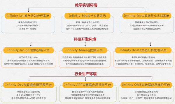 大数据应用协同创新中心是学校深化产教融合、推动“大数据+”战略的核心载体,依托教育部学校规划建设发展中心“数据中国‘百校工程’”项目,由学校与中科曙光共建。中心集成人才培养、科研创新、行业应用及社会服务功能,构建了600TB级大数据服务器集群,搭载Infinity 9000生态系统,集成Edu教学实验系统、Insight智能分析平台等13个技术服务模块,支撑数据科学与大数据技术专业建设。