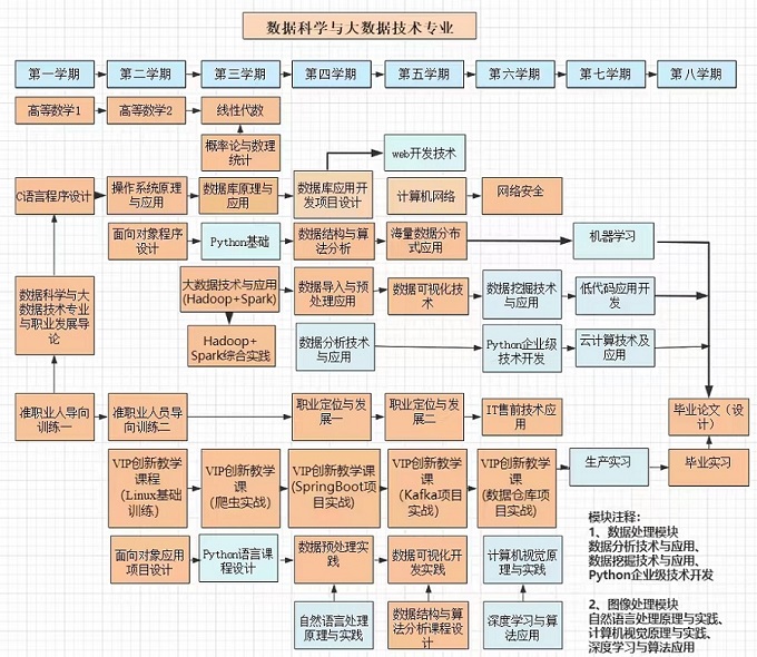 C 语言程序设计、面向对象程序设计、数据库原理与应用、数据结构与算法分析、操 作系统原理与应用、大数据技术与应用(Hadoop+Spark)、海量数据分布式应用、数据导 入与预处理应用、数据可视化技术、Python 企业级技术开发、数据挖掘技术与应用、数据分析技术与应用。
